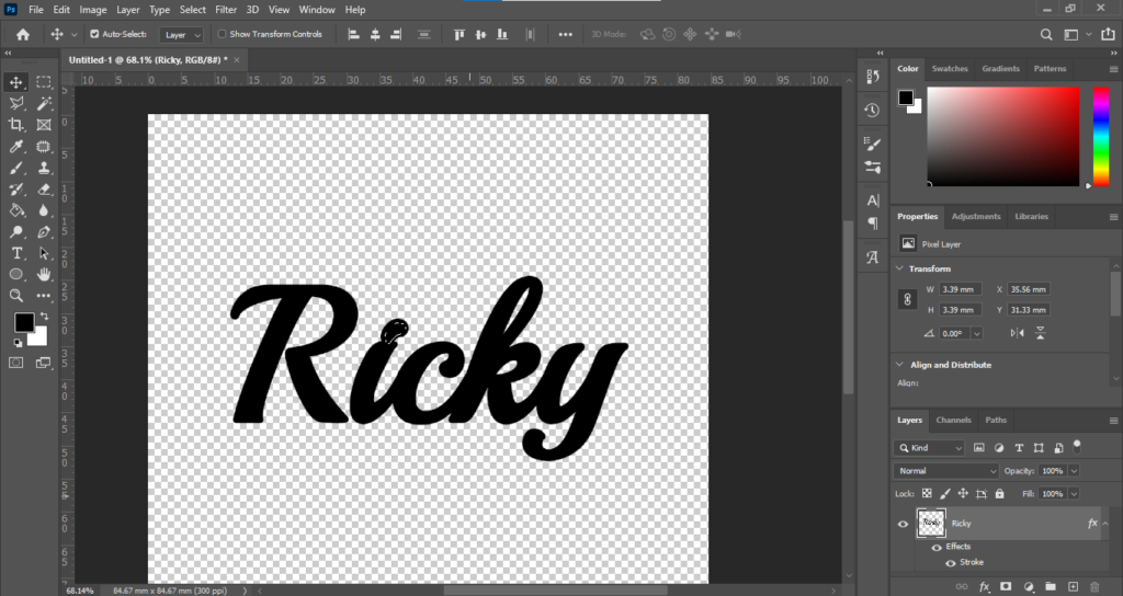 ⦁Select the Type Tool (T) and type the desired name (e.g., “Ricky“).